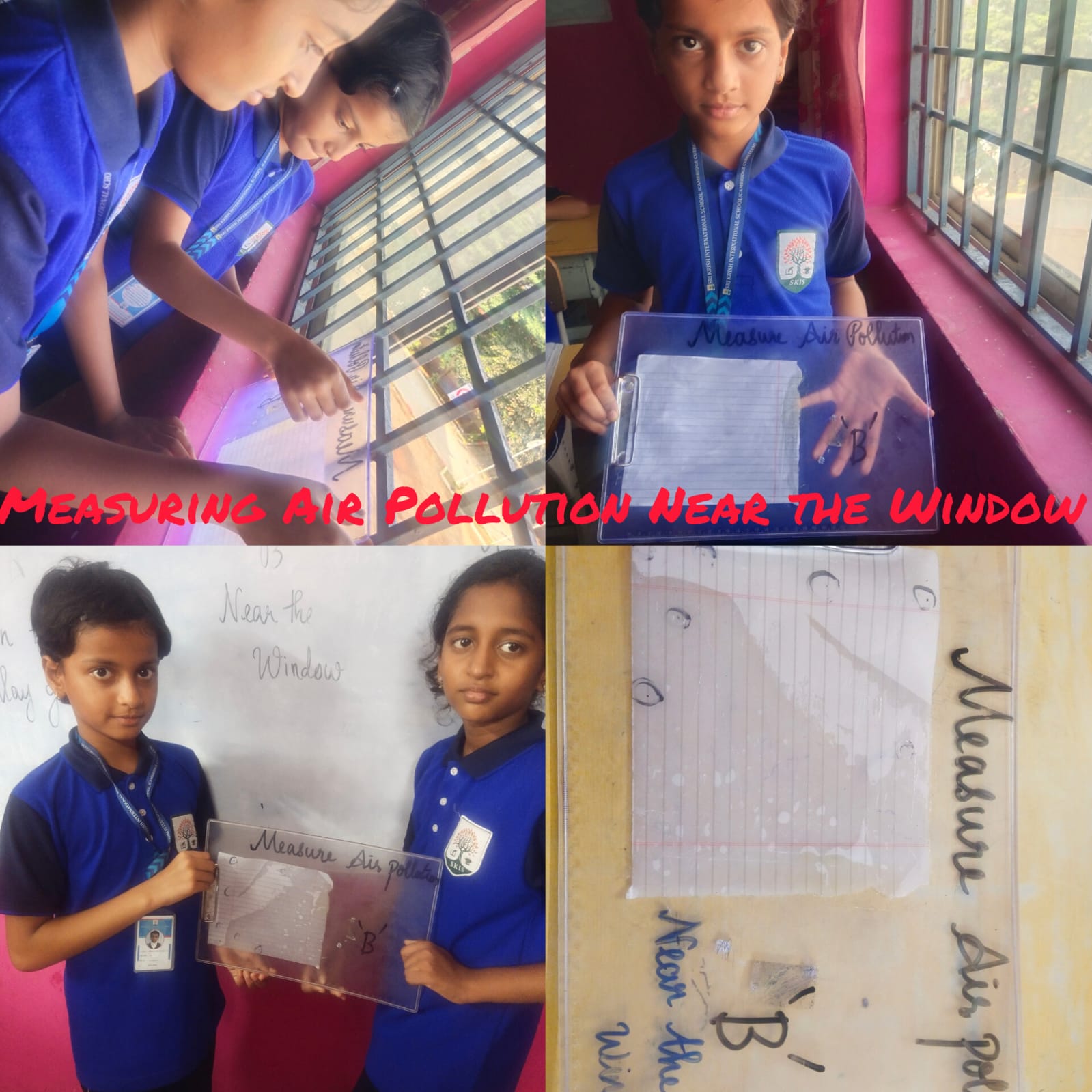 They prepared simple air pollution collectors using paper coated with petroleum jelly and placed them in three different areas: inside the classroom, near the window, and in the playground. After a few hours, students examined the sheets and compared the amount of dust and particles collected in each location.