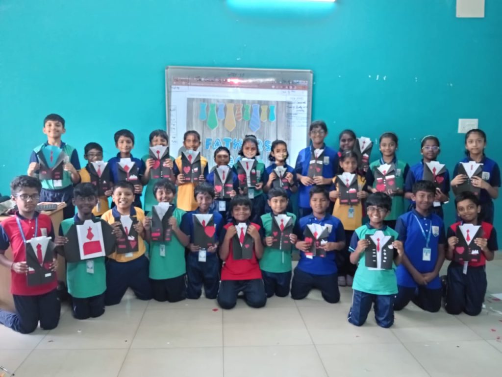 Students created handmade greeting cards to express love and appreciation for their fathers. Writing heartfelt messages and designing personalized cards nurtured emotional intelligence, gratitude, and communication skills. This activity strengthened family values and meaningful connections.